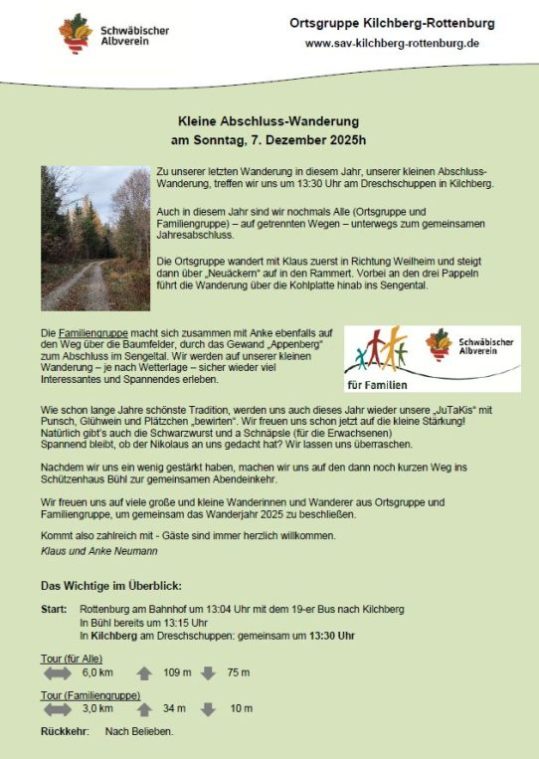 Wir freuen uns auf viele große und kleine Wanderinnen und Wanderer aus Ortsgruppe und Familiengruppe, um gemeinsam das Wanderjahr 2025 zu beschließen.